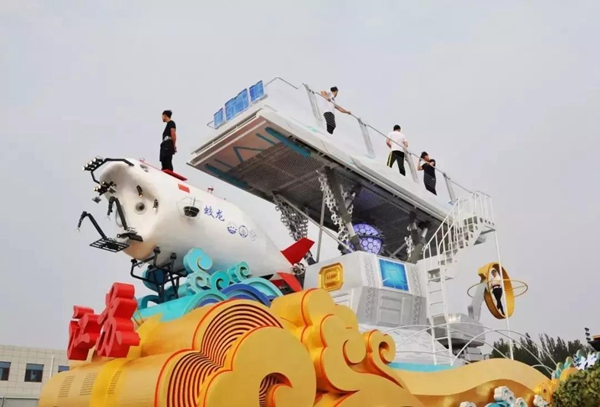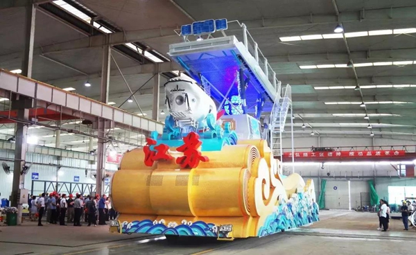 彩车上展示了徐工研发的国内首个变形机械模型——“钢铁螳螂”,而彩车的底盘部分由徐工专属打造。