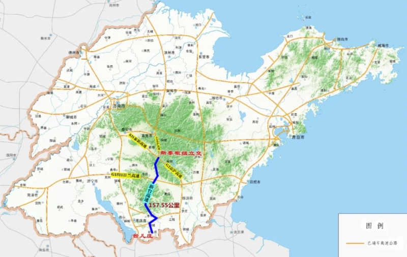 新台高速是山东省“九纵五横一环七射多连”高速公路网中“纵五”线的重要组成部分。项目全长157.548公里,概算总投资154.5亿元,双向四车道,设计速度120公里/小时,全线共有8座隧道,是目前山东省内在建高速公路项目中规模最大的隧道群。