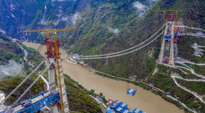 这次金沙江特大桥的缆索吊机是由我国自主研发的,最大吊重达800吨,被誉为“世界第一吊”,是目前世界上吊重最重的缆索吊机。由于施工场地受限,缆塔塔顶至钢梁拼装场高差330米,也是目前世界上起吊高度最大的缆索吊,由于整座大桥跨越金沙江,两岸山体陡峭,缆塔塔顶至钢梁拼装场高差达到330米。同时,缆索吊的主索数量多达48根,要保证各个吊点受力均匀,在场地受限的情况下,给整个吊装带来很大困难。