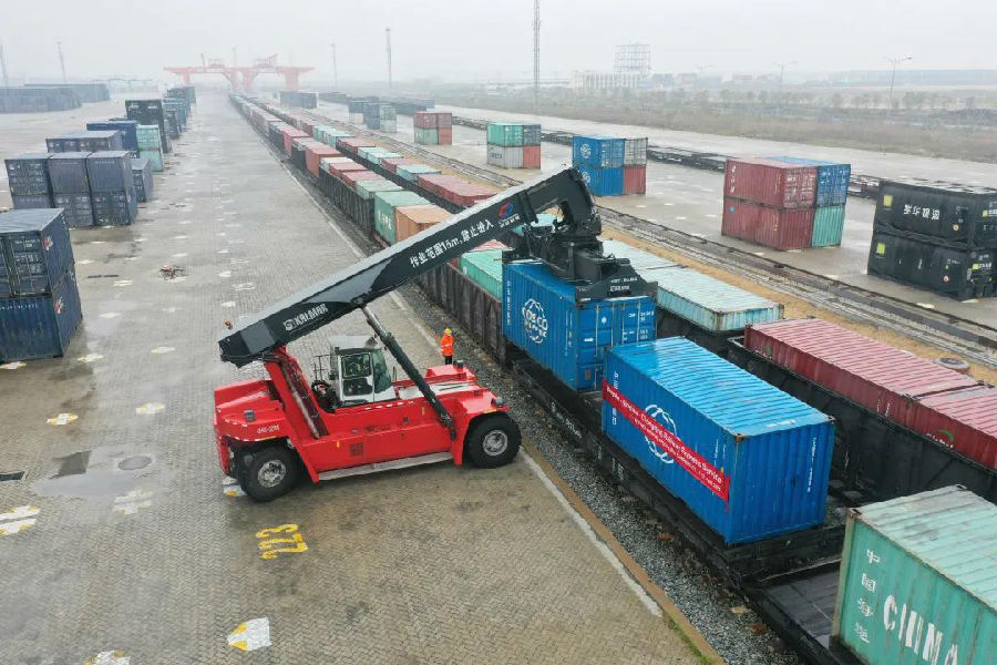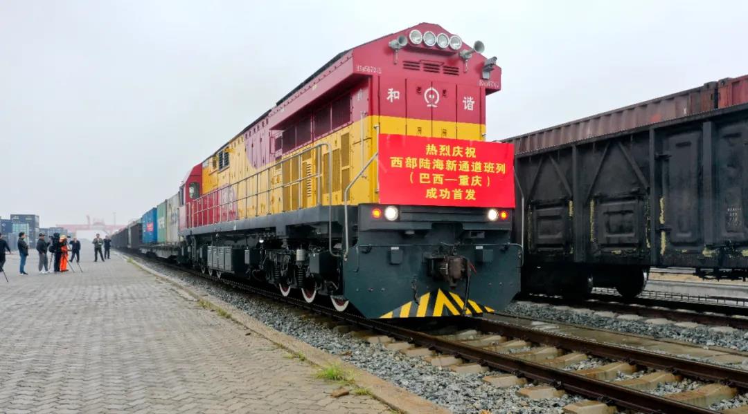 近日,钦州港铁路集装箱中心站,装载着来自巴西的40个集装箱浆纸搭乘西部陆海新通道班列始发重庆。