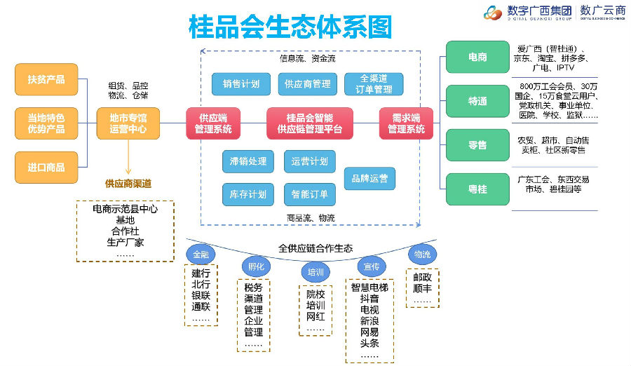 为有效汇聚广西特色产业数据,解决长期以来供需双方多端信息不对称、快递物流不通畅、融资贷款困难、资金周转不及时等问题,数字广西集团积极打造“桂品会”智能供应链平台助力乡村振兴。目前,该平台已累计促成签约金额超3亿元,实现消费金额超2.7亿元,带动脱贫人数超9.2万人,工作成效显著。