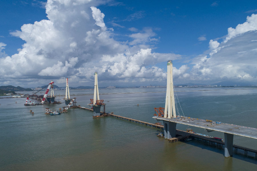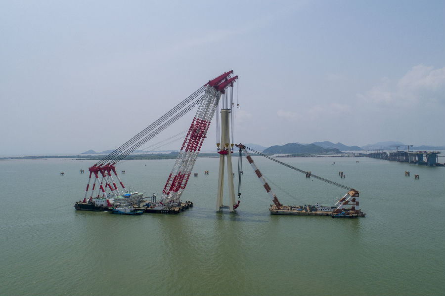 大桥的钢塔全部采取工厂化制造。架设时,先在1200吨浮吊的配合下,利用我国自主研制的目前最大起重量为3600吨的双臂浮吊完成钢塔空中翻转、竖转至铅锤状态后,再吊至桥墩上方,与桥墩钢箱梁顶面预留节段精确对位。