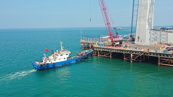 当天中午13时,先导索与伶仃洋大桥西主塔处下放的钢绳相接,在海事部门的全程护航下,牵引船拽拉着先导索,拖拽至东主塔中跨平台处连接。