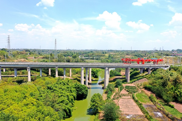 近日,随着最后一榀箱梁平稳落到成自泸高速立交双线特大桥53号至54号墩台上,成自高铁自贡境内箱梁全部架设完成。至此,由蜀道集团投资的成自宜高铁在自贡境内全线均已完成箱梁架设。
