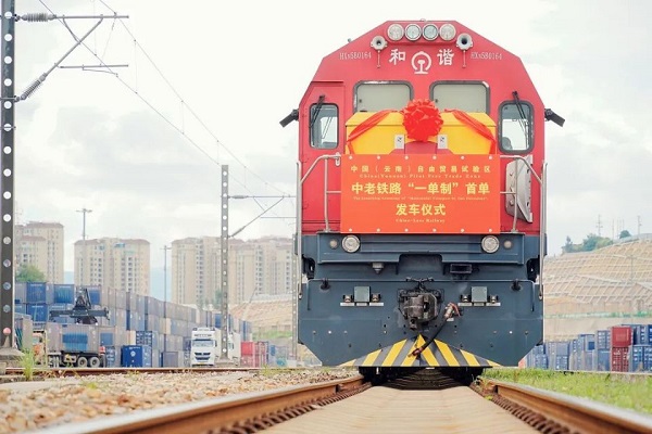 8月30日上午11时,中国(云南)自由贸易试验区中老铁路“一单制”首单发车仪式在中铁联集昆明中心站举行。共计23车46箱满载云天化集团1200余吨货值120余万美元(折合人民币860余万元)货物的列车从王家营西站缓缓驶出。该趟列车同时也是云投集团旗下省国际班列组织发运的第1000列中老铁路跨境货物列车。