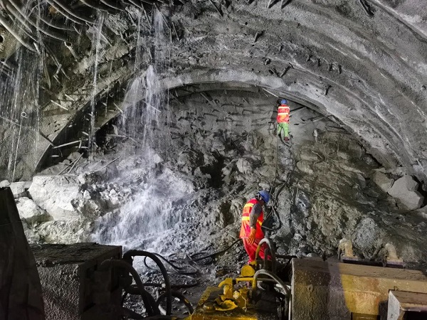 天生桥隧道是临双高速重点控制性工程、关键节点工程,由云南交投集团所属云岭建设公司承建,位于临沧市、双江县交界处,为分离式特长隧道,全长10447米,其中左幅长5200米,右幅长5247米。隧道场区地下水丰富,水文条件复杂,围岩差异风化明显,自稳能力差,具有极强突变性,施工过程中掌子面围岩陡变的情况相对频发,导致现场施工难度急剧增加。同时,场区地下水受大气降水及地表地形影响明显,雨季期间沟谷地形地表水汇集,并沿着下伏基岩的节理、风化裂隙向下渗透,导致隧道内出水量具有较强季节性规律,出水量最大时达到18000m³/天。此外,因花岗岩节理裂隙间多夹杂泥质、砂质等填充物,填充物遇水后易软化,导致围岩自稳能力进一步降低,拱部围岩在临空状态下持续掉块现象多发,极易发生塌方。自2017年进洞施工以来,天生桥特长隧道发生冒顶、坍塌、突泥涌水共计148次,处治天数约1350天。