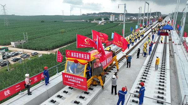 2023年8月18日上午,在新建南宁至玉林铁路学冲村特大桥铺轨施工现场,随着首对500米长钢轨平稳铺设在无砟道床板上,标志着新建南宁至玉林铁路项目正式进入全线铺轨阶段。
