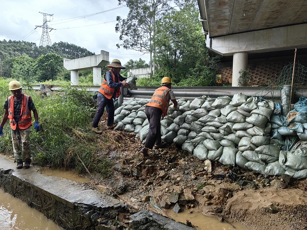 珠肇高铁4标项目团队堆码沙袋做好防护
