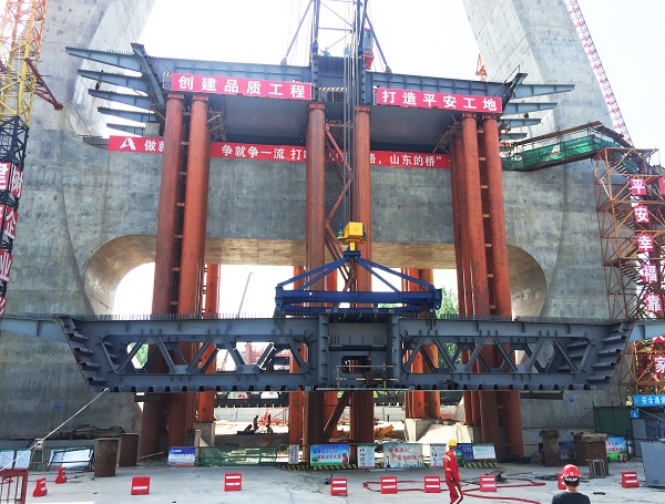 针对传统施工缺陷,为确保黄河区域生态效益,山东高速路桥集团在泰东高速黄河大桥施工中自主研发制造了钢箱梁悬臂拼装桥面吊机,并于5月14日顺利完成了泰东高速黄河大桥首节箱梁吊装。