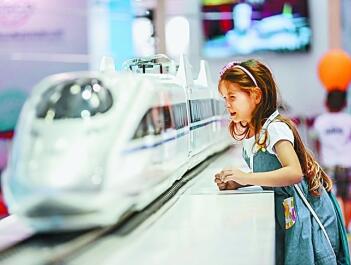 一个女孩在第82届萨洛尼卡国际博览会中国馆参观中国高铁列车模型。新华社发