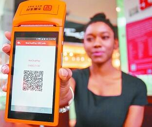 在加拿大多伦多约克戴尔购物中心,工作人员展示一名顾客所购商品的微信支付收款二维码金额(加拿大元)。新华社发