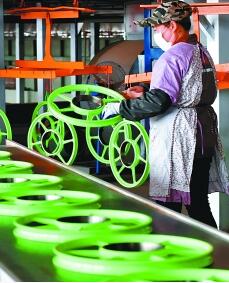 浙江武义经济开发区的一家企业,员工在生产线上赶制共享单车轮毂。新华社发