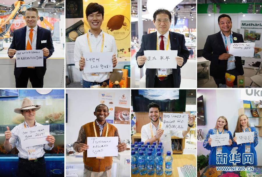 11月10日,进博会上不同国家的参展人员展示用不同语言书写的“明年见”(拼版照片)。 首届中国国际进口博览会11月5日至10日在上海举行。记者在采访中了解到,很多参展商在进博会上收获了不少订单,宣传了自己的产品,结识了很多朋友。他们表示,希望明年再来进博会。 (新华社记者 侯东涛 摄)