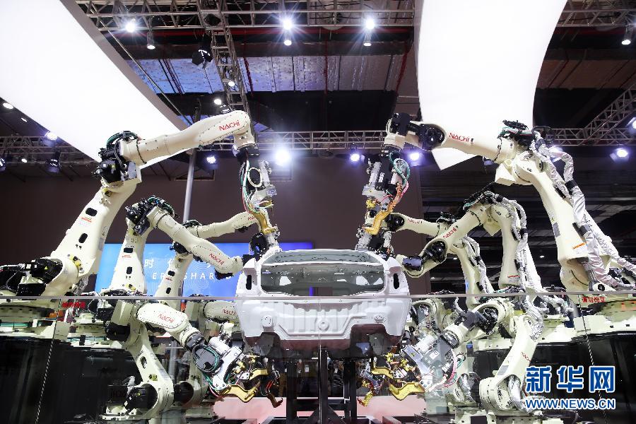 11月6日,日本那智不二越公司展出的点焊密集协作机器人在进行作业演示。 11月5日至10日,首届中国国际进口博览会在上海国家会展中心举行。 (新华社记者 丁汀 摄)
