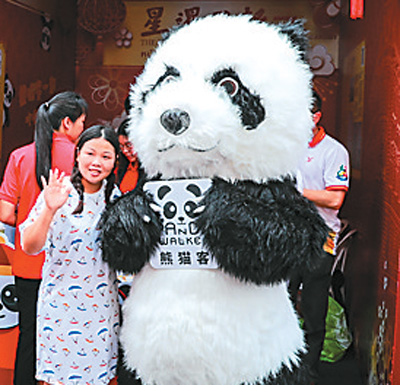 中国游客在泰国曼谷唐人街与熊猫人偶合影。新华社记者 张可任摄
