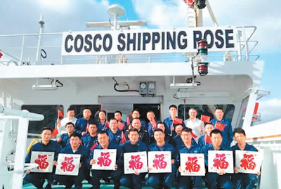 中国工作人员在“中远海运玫瑰”轮上过春节。受访者供图