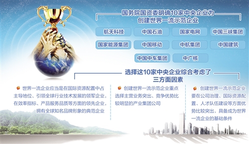 据介绍,国资委综合考虑三个方面的因素,选择航天科技等10家中央企业作为创建世界一流示范企业。