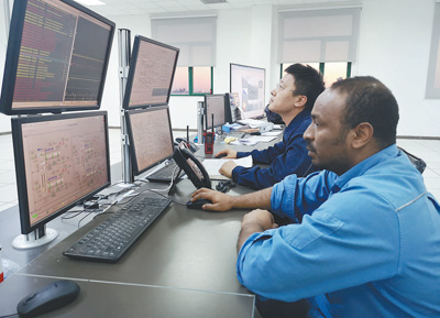 在米桑油田的中控室,中伊两国值班人员正通过电脑屏幕控制油田设备。(曲翔宇摄)