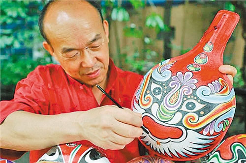 第十五届文博会锦绣中华分会场非遗艺人在制作脸谱面具。