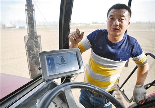 宁夏吴忠市利通区金积镇塔湾村村民介绍装在拖拉机上的北斗导航系统。(王鹏摄)