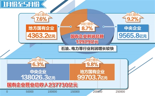 统计显示,1月份至5月份,国有企业营业总收入237730亿元,同比增长7.7%。其中,中央企业138026.3亿元,同比增长6.3%;地方国有企业99703.7亿元,同比增长9.8%。