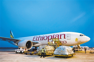 执飞非洲全货机定期航线的飞机在重庆江北国际机场上装卸货物。(新华社记者 刘 潺摄)
