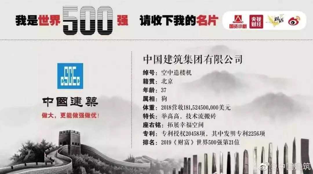 比如绰号空中造楼机的中国建筑,2019世界500强排名第29位,特长是“举高高,技术流搬砖”,座右铭是拓展幸福空间。