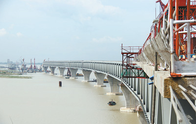 如今,孟加拉国政府选择在达卡西南部约40公里处修建帕德玛大桥,工程包括帕德玛大桥主桥、河道疏浚、帕德玛大桥铁路连接线和公路连接线,其中中铁大桥局负责帕德玛大桥主桥建设,中国中铁股份有限公司(简称中国中铁)负责帕德玛大桥铁路连接线建设,中国电建集团旗下的中国水电港湾公司负责河道疏浚,还有其他中企参与帕德玛大桥公路连接线建设。