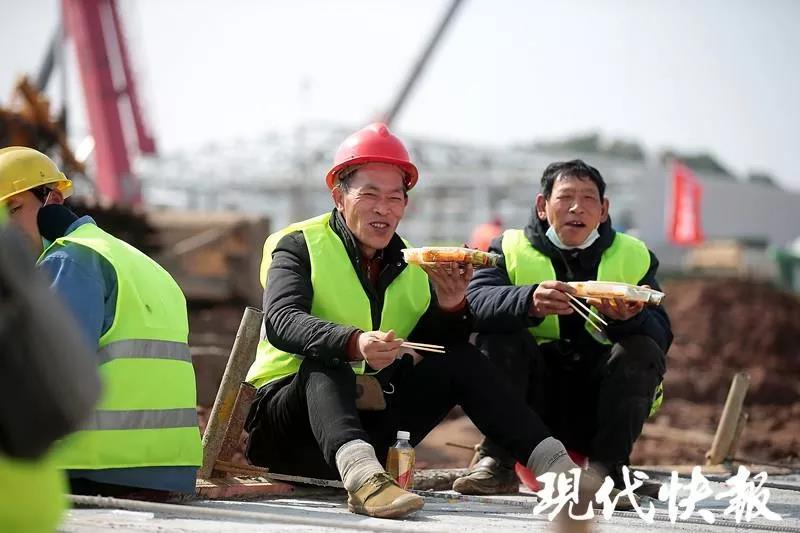 90后河南洛阳小伙李凯凯就是其中一员。中午12点半,他却一点也没要休息的意思。他站着,手捧一份盒饭,匆匆几口扒完了菜,又大口大口往嘴里扒白饭。他一边嚼着饭,一边说,“年初三刚到这里时,混凝土还没凝结,你再看看现在这里是什么样子!” 如今,工地上的板房都已安装就绪,已经能看出医院的雏形。