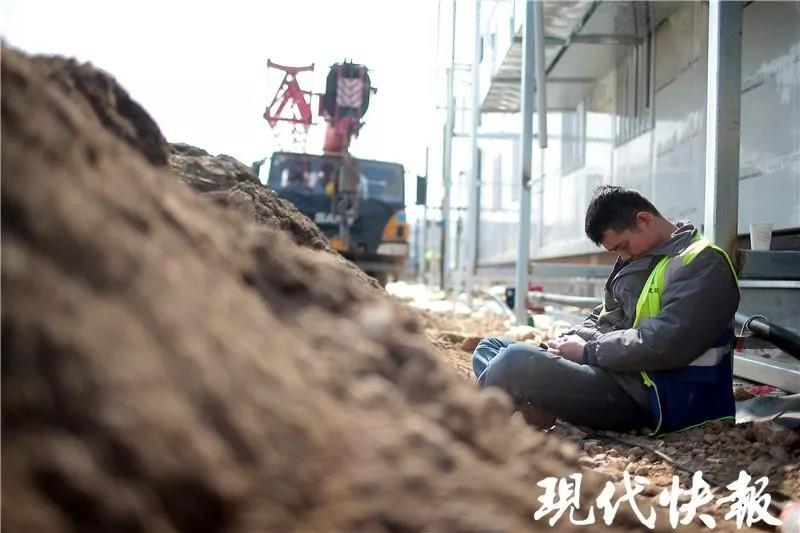即便是在吃饭时,工人们也不会离开工地,大家就在自己的岗位上捧起盒饭,大口大口吃起来。午歇时,大部分工人都主动加班工作,有人实在累极了,就地坐下小憩片刻,身下就是潮湿的泥土,他们也毫不在意。
