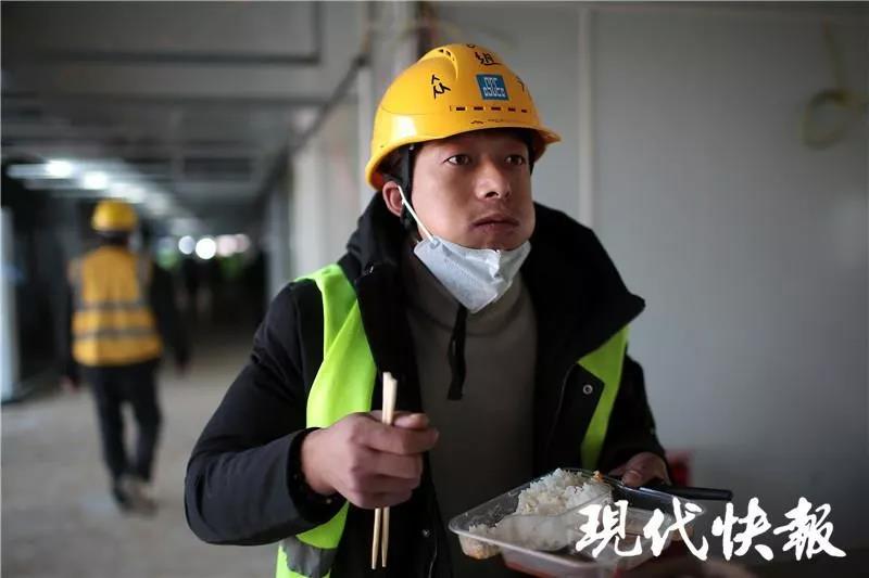 “这里忙完了,后面再去雷神山。” 他匆匆吃完饭,戴好口罩,又开始忙碌起来。他所在的工区,电工、水工都在布设管线,李凯凯作为协调员忙个不停。“我平时是做水电安装的,来这里后在工地上做协调。”这个瘦削的小伙子一身是劲,前一天忙到凌晨3点才休息,根本不理会12小时一个班,对他来说是24小时待命,这片工地就是他的战场。