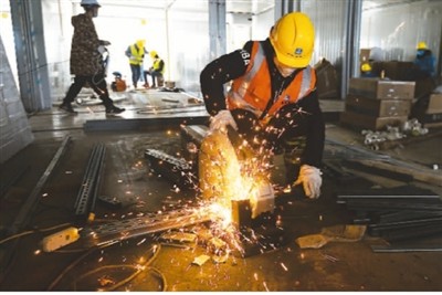 1月31日,工人在切割钢管,制作医院钢结构坡道和楼梯。(中建三局供图)