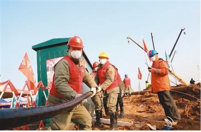 图为1月29日工人正在铺设HDPE膜。(中建三局供图)