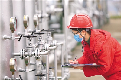 春节以来,位于四川省遂宁市的中国石油西南油气田分公司川中油气矿磨溪天然气净化厂满负荷生产,平均日产天然气445万立方米,全力保障区域内民生和工业用气安全稳定供应。图为2月18日,川中油气矿磨溪天然气净化厂工人正在抄表。钟 敏摄(人民视觉)