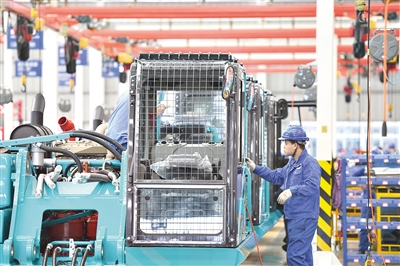 在位于湖南省长沙经开区的山河智能装备股份有限公司,工作人员在中型挖机装配车间作业。