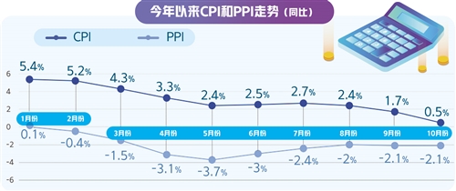 10月份,CPI同比上涨0.5%,涨幅比上月回落1.2个百分点,环比下降0.3%。