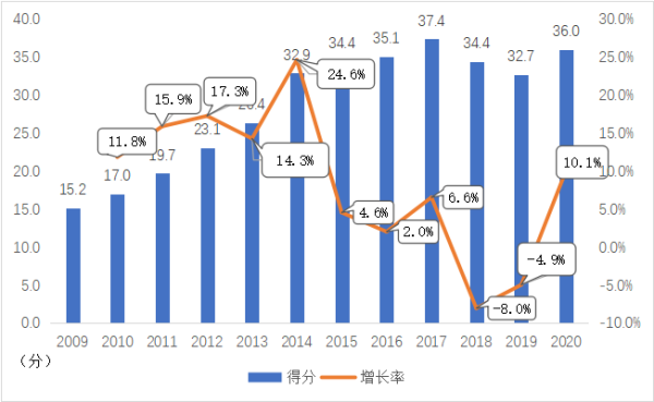 2009-2020年中国企业300强社会责任发展指数变化趋势
