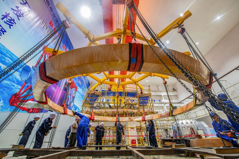 中核集团核工业西南物理研究院的工作人员在安装调试中国环流器二号M装置时起吊线圈。