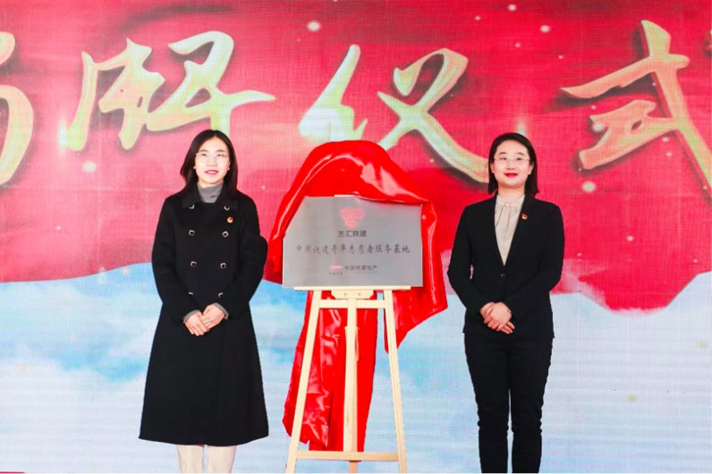中国铁建房地产集团有限公司团委书记王琭璐与张家口市万全团区委孙志君共同为“中国铁建青年志愿者服务基地”揭牌