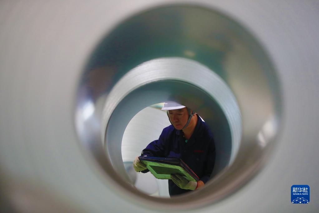 8月18日,在本钢冷轧厂,工人对钢卷进行质量检测。新华社记者 杨青 摄