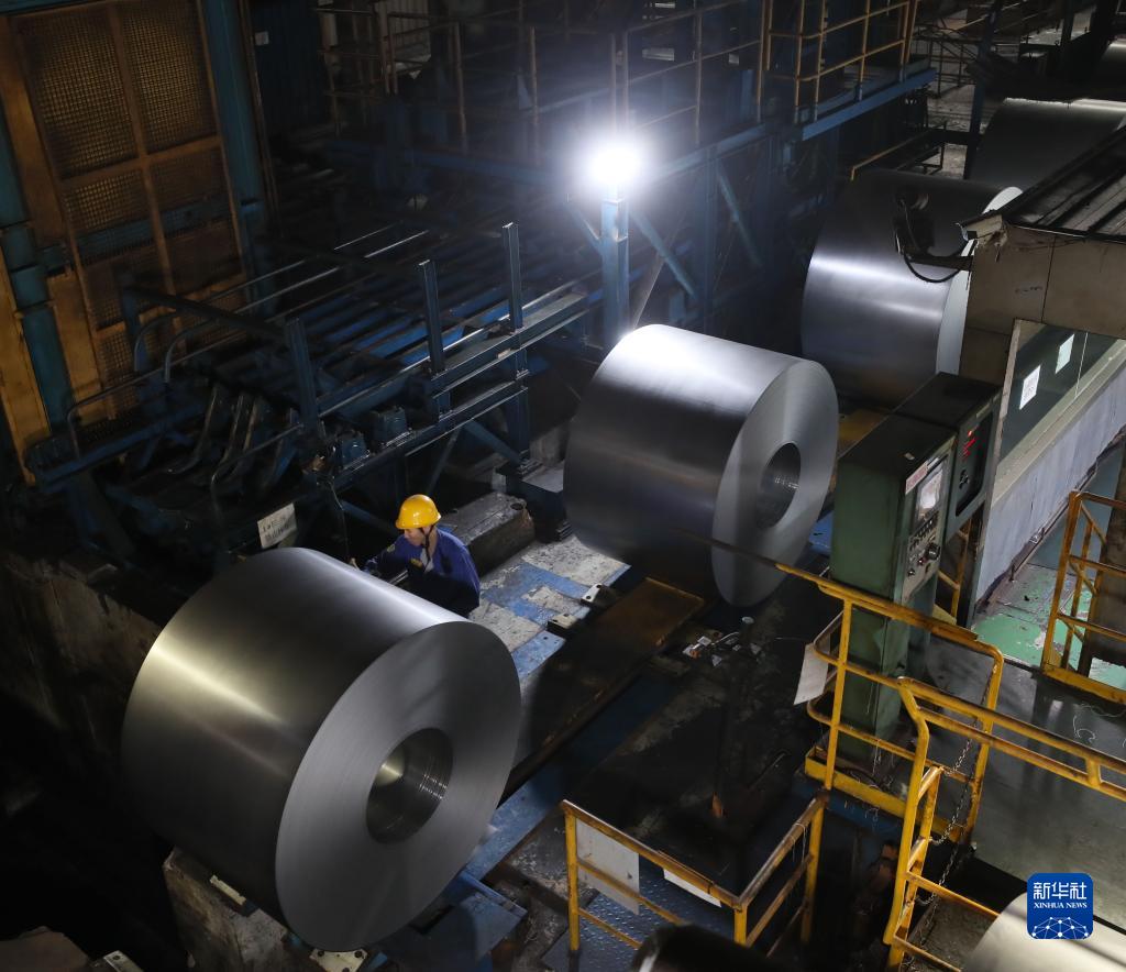 8月19日,在鞍钢股份冷轧厂的镀锌线作业区,工人对钢卷进行质量检测。新华社记者 杨青 摄