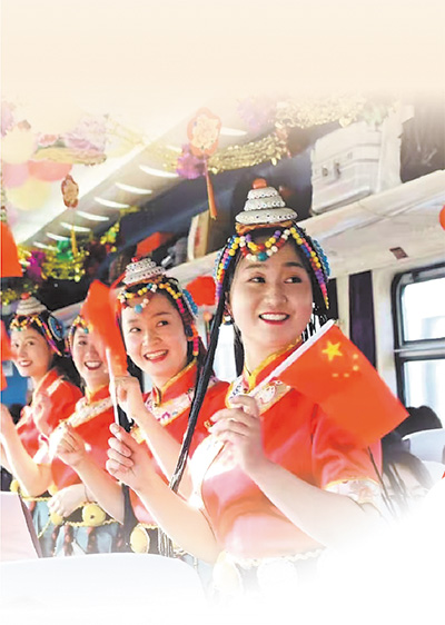 西宁开往拉萨的列车上,乘务人员与旅客联欢。资料照片