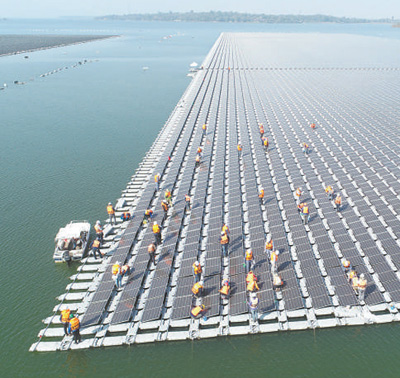 2021年1月23日,施工人员检查泰国乌汶府诗琳通大坝综合浮体光伏项目的太阳能板安装情况。新华社发