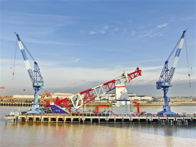 1月7日,由中交一航局投资研发、上海振华重工建造的140米级打桩船“一航津桩”在江苏启东正式交付。新华社发(许丛军 摄)