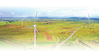 河北省张家口市张北县风力发电机组一景。