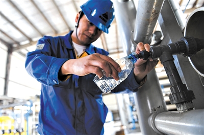 ▲国家能源集团旗下公司废水处理中心,一名工作人员展示经过处理后的污水。记者 刘磊 摄