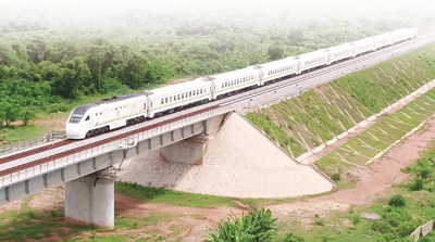 在西非广袤的平原上,一列绿白相间的火车正在奔驰,褐色的铁轨向南北延伸,这是尼日利亚拉各斯—伊巴丹铁路(简称拉伊铁路)。