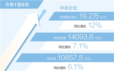 记者从国务院国资委举行的中央企业负责人研讨班上获悉:今年1至6月,中央企业实现营业收入19.2万亿元、利润总额14093.6亿元、净利润10857.5亿元,同比分别增长12%、7.1%、6.1%。上半年,中央企业发展质量进一步提高,营业收入利润率保持较高水平,资产负债率总体保持稳定,投资贡献持续加大,有力带动了产业链上下游企业协同发展。