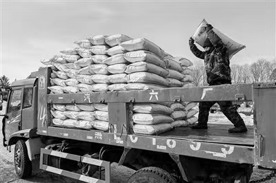 北大荒集团五大连池农场科技服务中心工人在装运肥料。新华社发