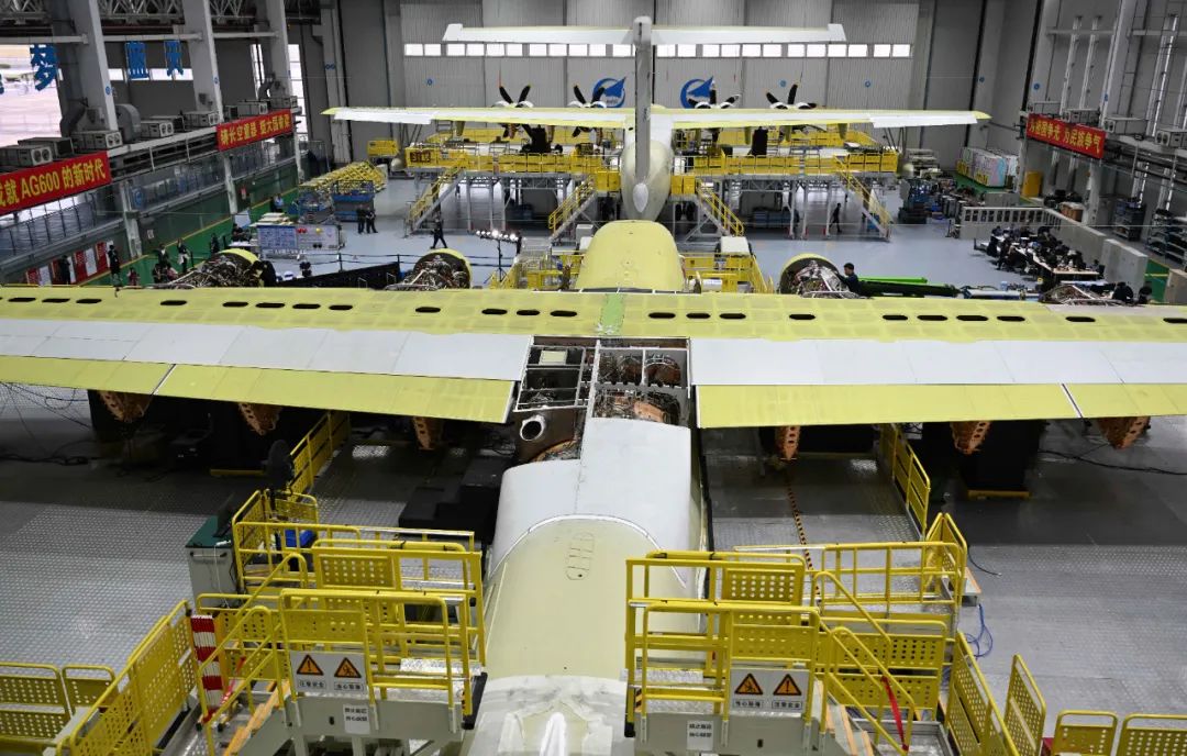 在广东珠海的中航通飞华南飞机工业有限公司总装线上,AG600M 正在总装(2022年11月7日摄)